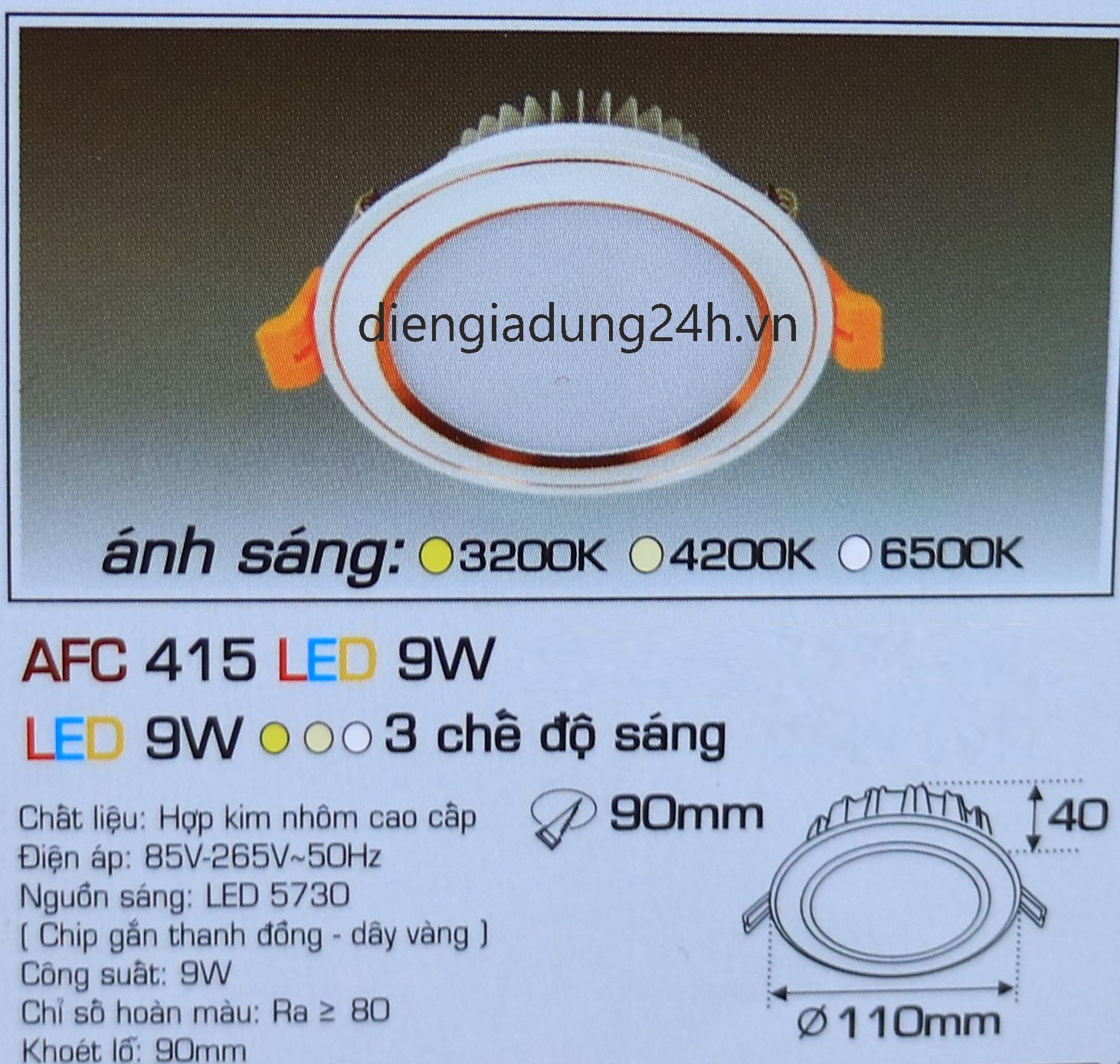 Kích thước: Ø 110 x H 40 mm, Khoét lỗ: Ø 90 mm