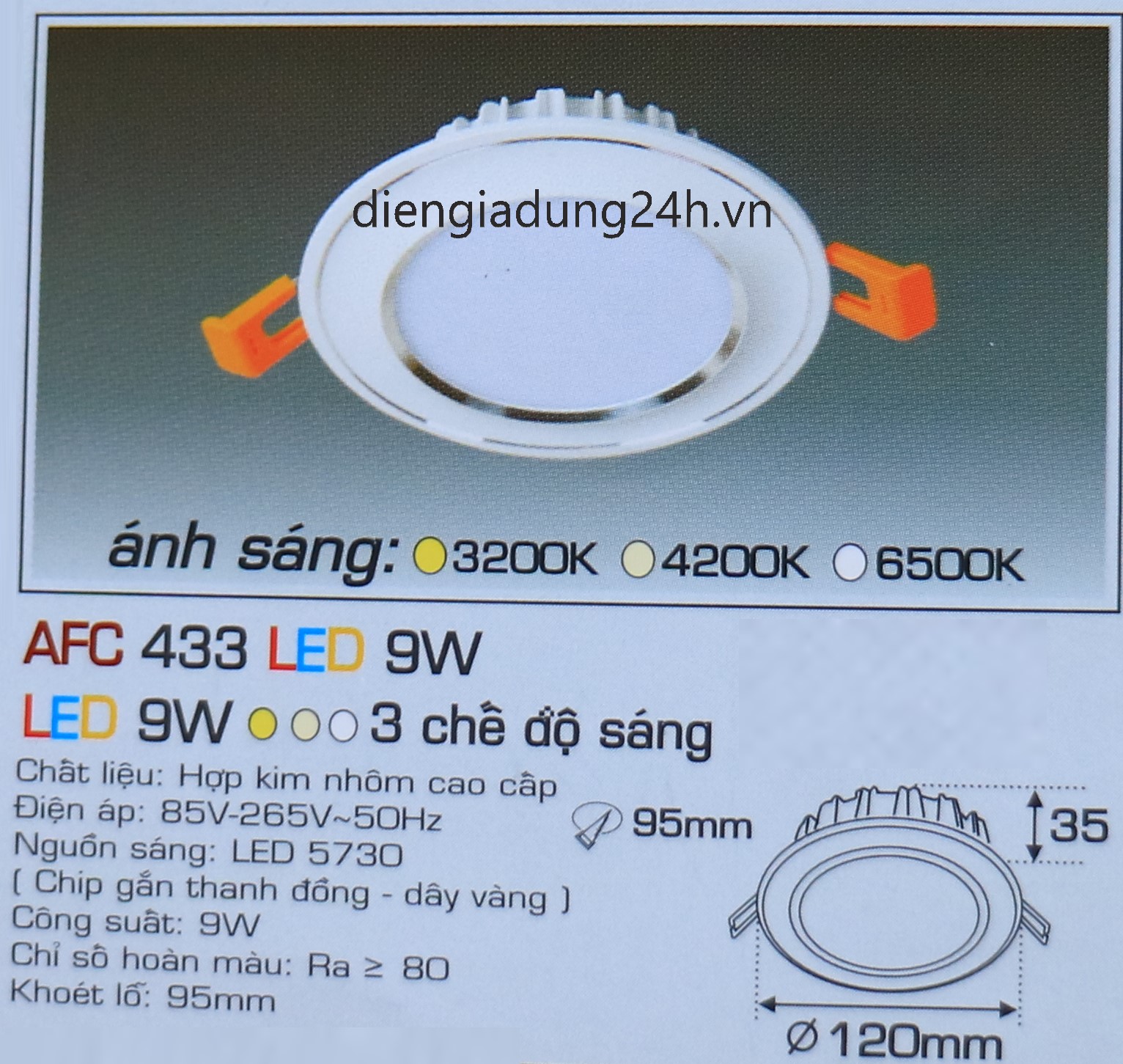 Kích thước: Ø 120 x H 35 mm, Khoét lỗ: Ø 95 mm