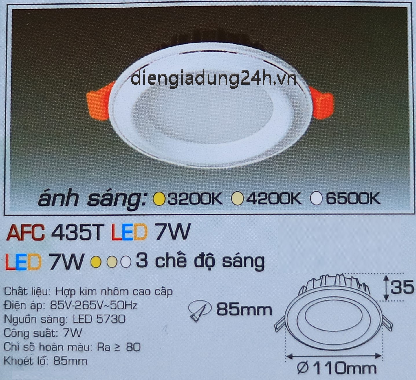 Kích thước: Ø 110 x H 35 mm, Khoét lỗ: Ø 85mm