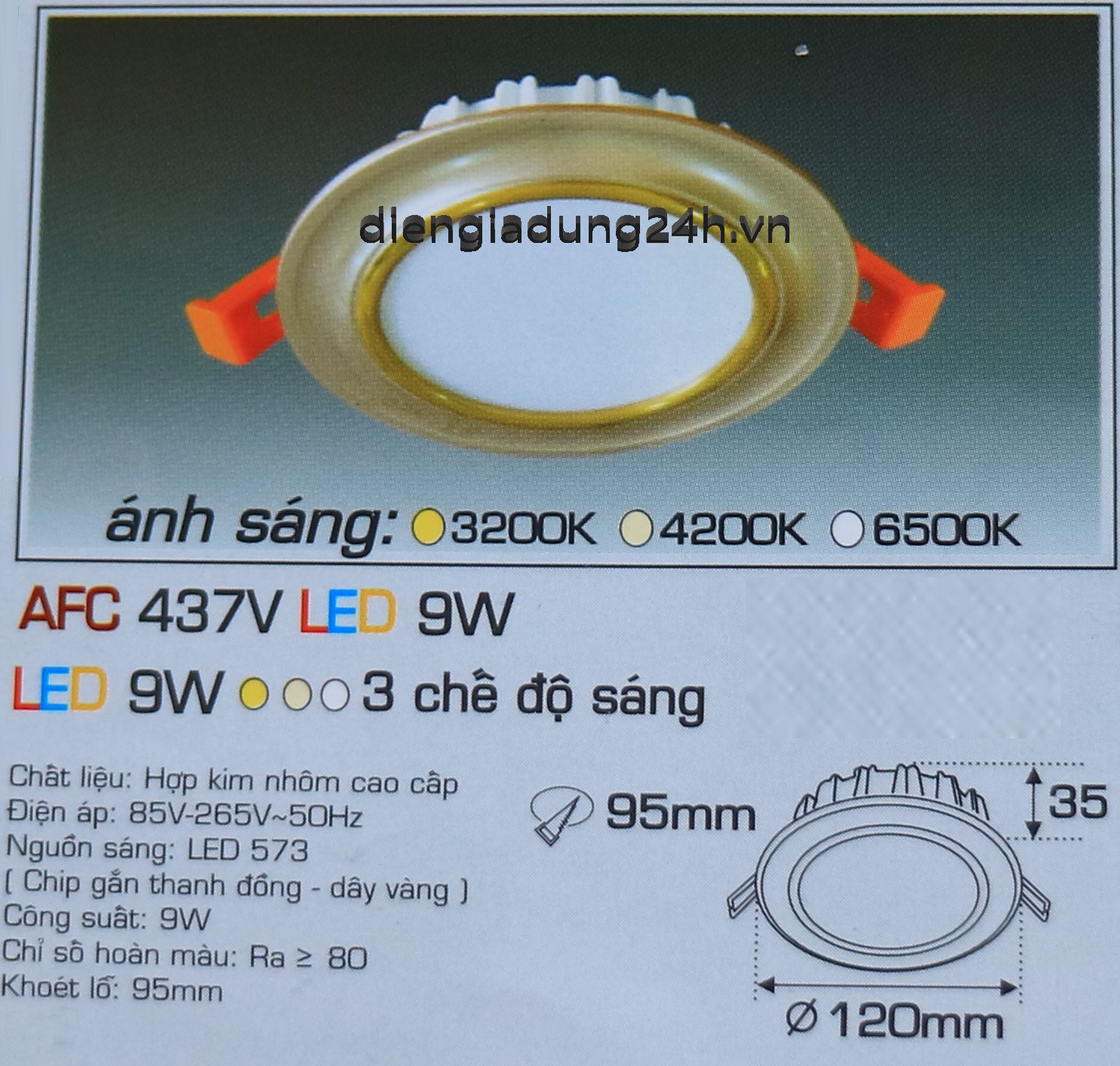Kích thước: Ø 120 x H 35 mm, Khoét lỗ: Ø 95 mm