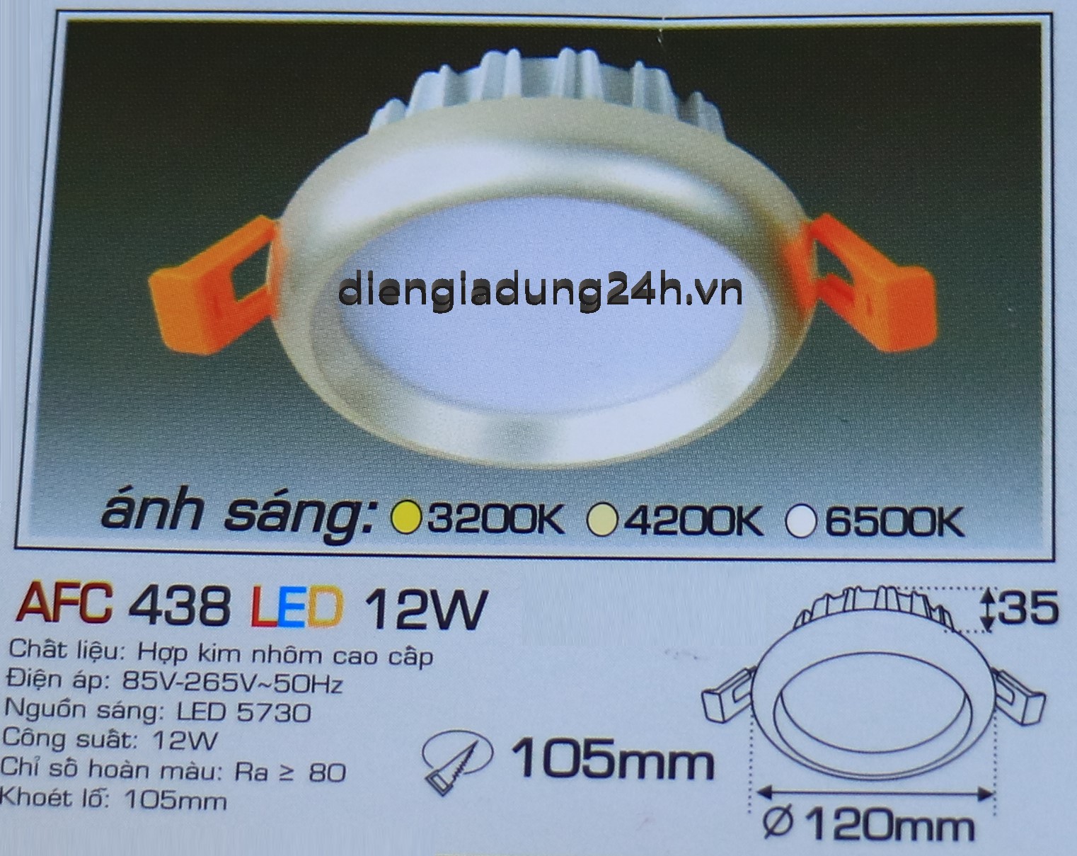 Kích thước: Ø 120 x H 35 mm, Khoét lỗ: Ø 105 mm
