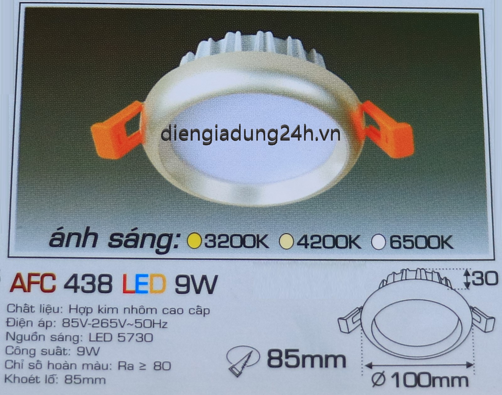 Kích thước: Ø 100 x H 30 mm, Khoét lỗ: Ø 85 mm