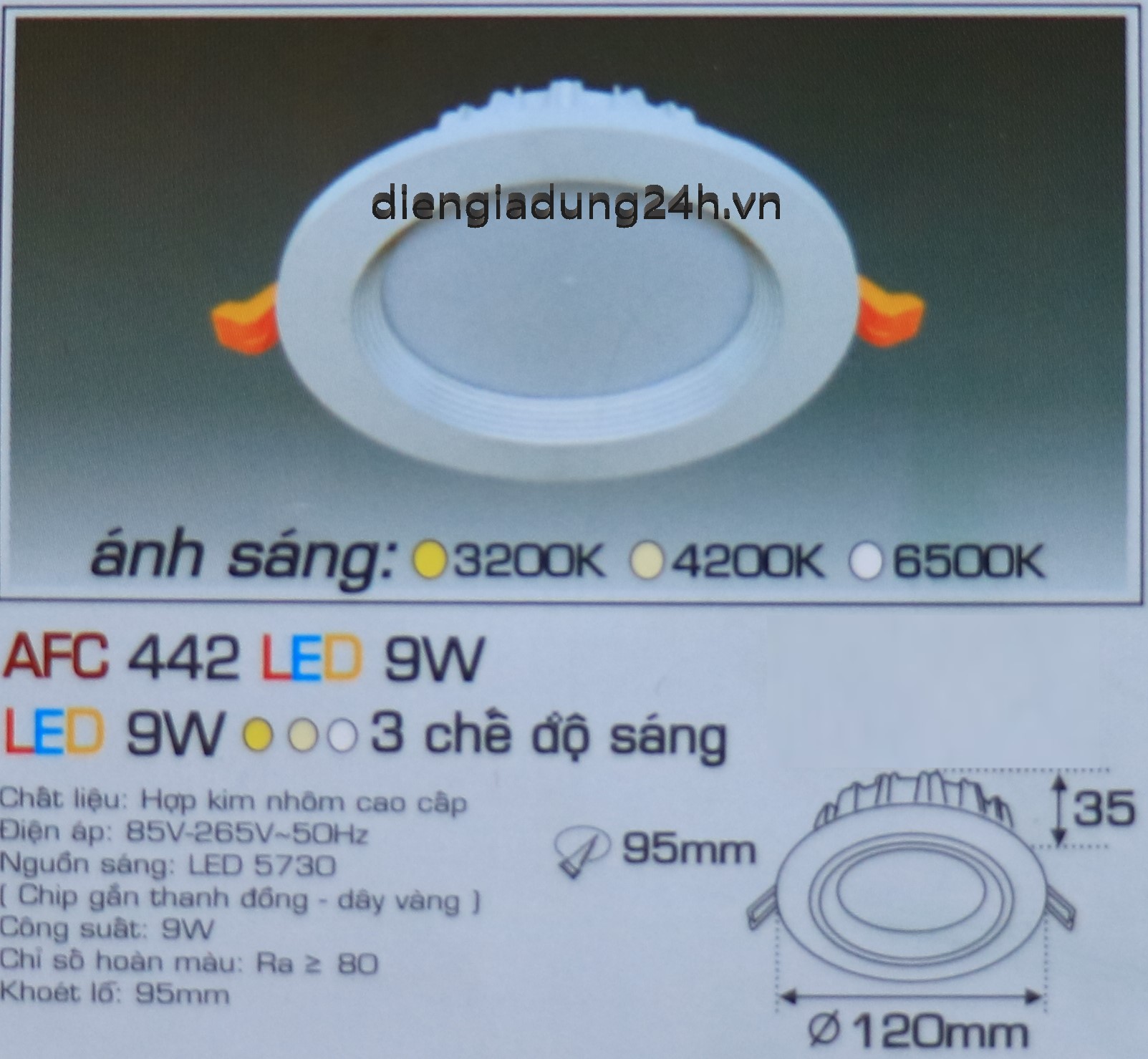 Kích thước: Ø 120 x H 35 mm, Khoét lỗ: Ø 95 mm