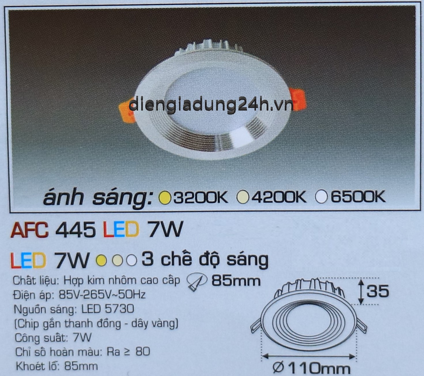 Kích thước: Ø 110 x H 35 mm, Khoét lỗ: Ø 85 mm