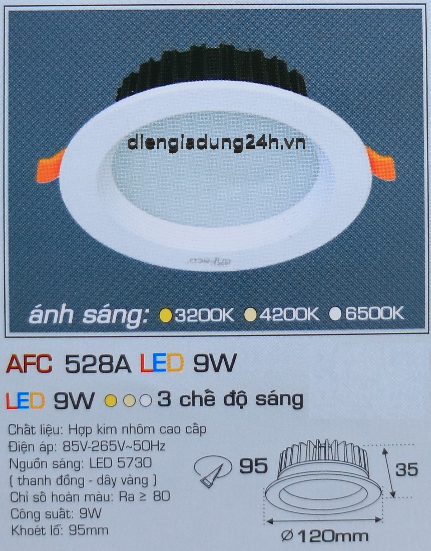 Kích thước: Ø 120 x H 35 mm, Khoét lỗ: Ø 95 mm