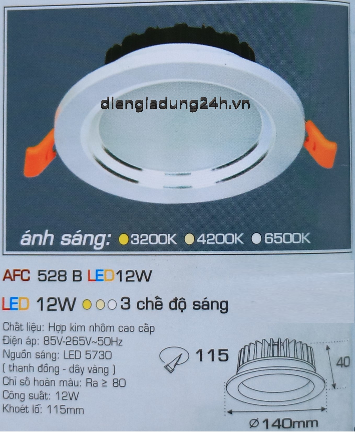 Kích thước: Ø 140 x H 40 mm, Khoét lỗ: Ø 115 mm