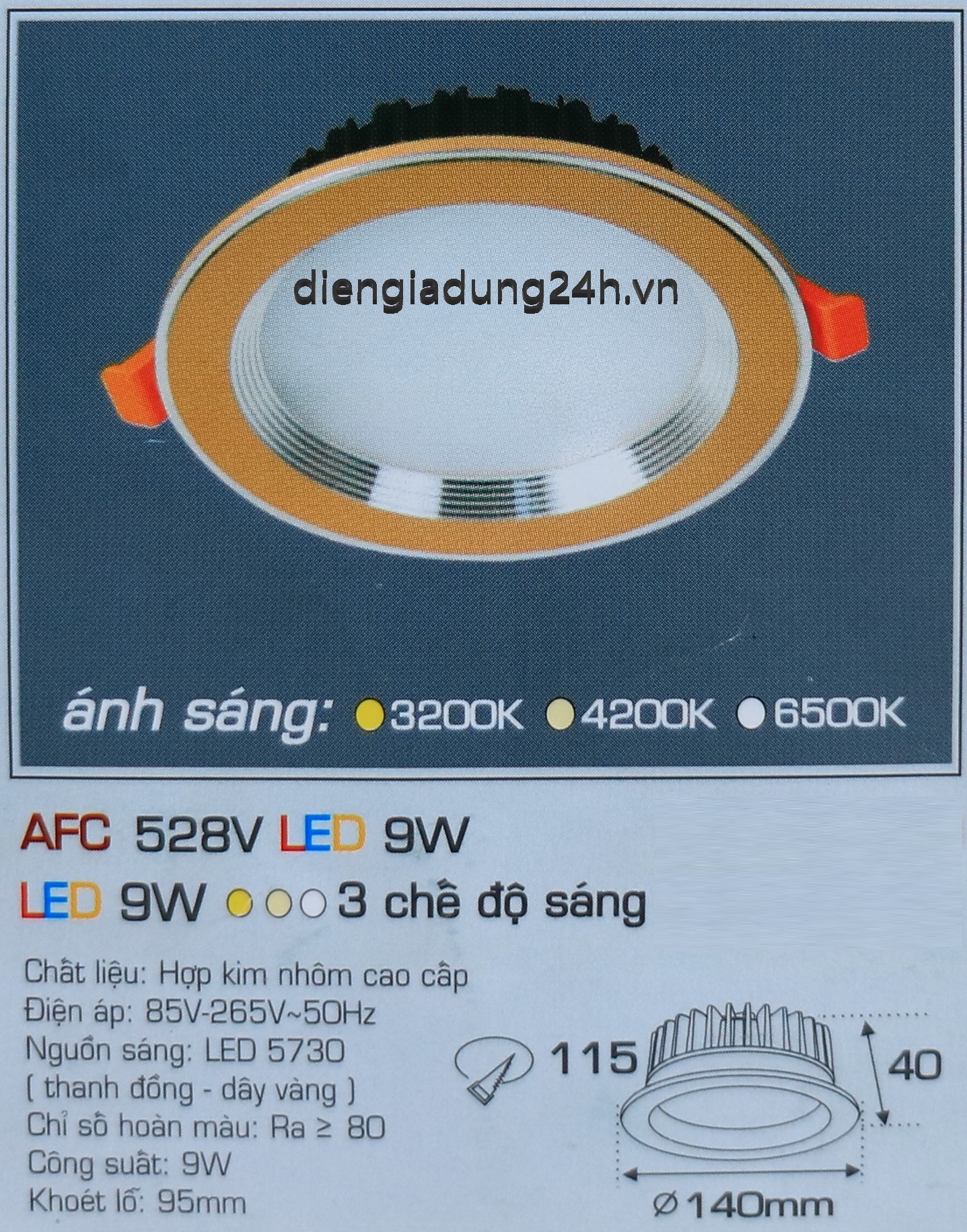 Kích thước: Ø 140 x H 40 mm, Khoét lỗ: Ø 115 mm