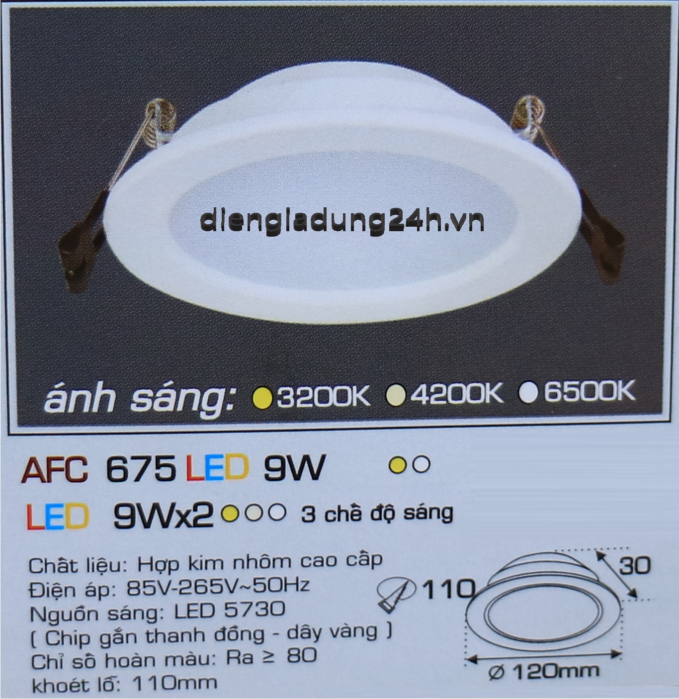 Kích thước: Ø 120 x H 30 mm, Khoét lỗ: Ø 110 mm