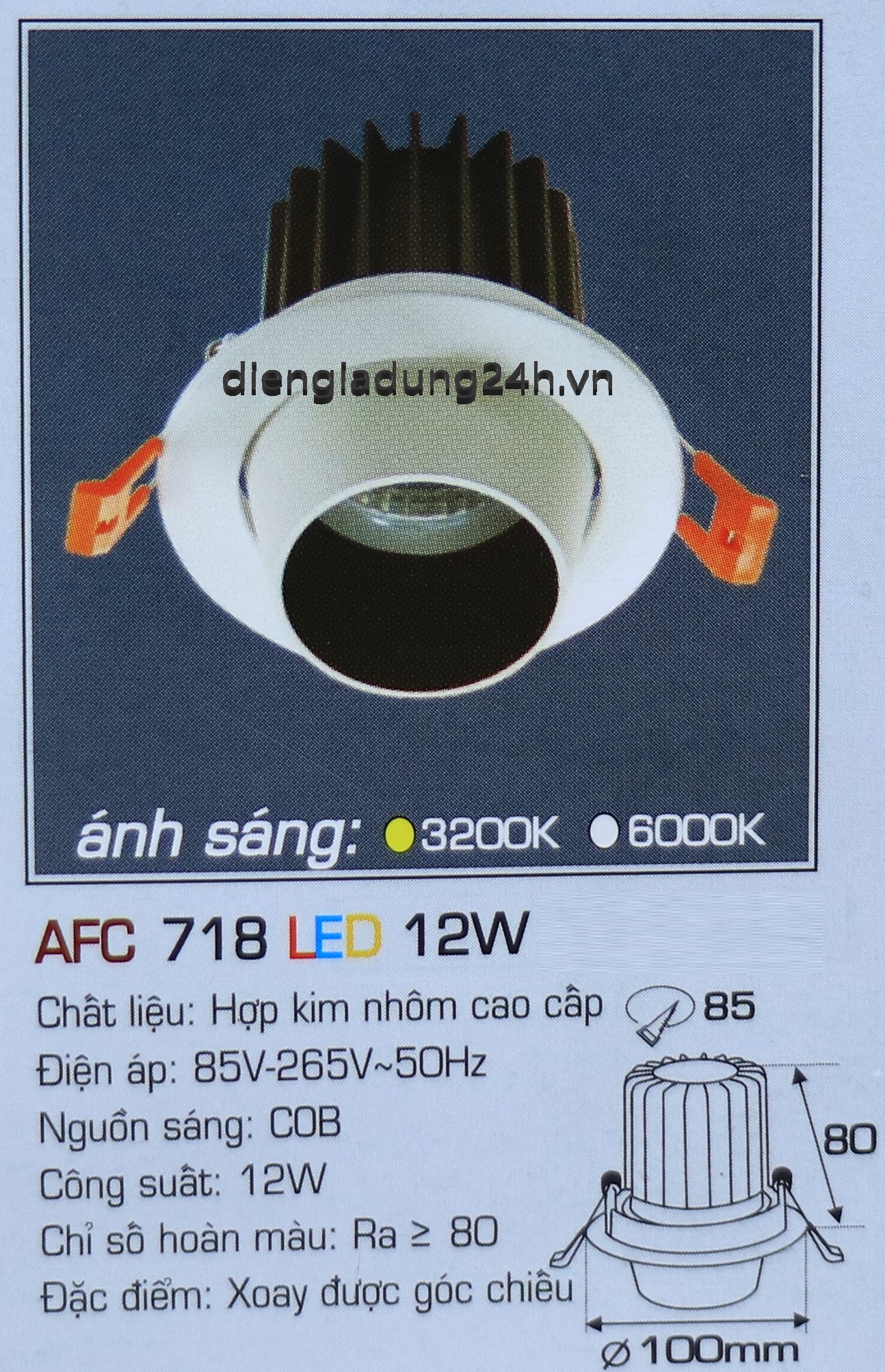 Kích thước: Ø 100 x H 80 mm, Khoét lỗ: Ø 85 mm