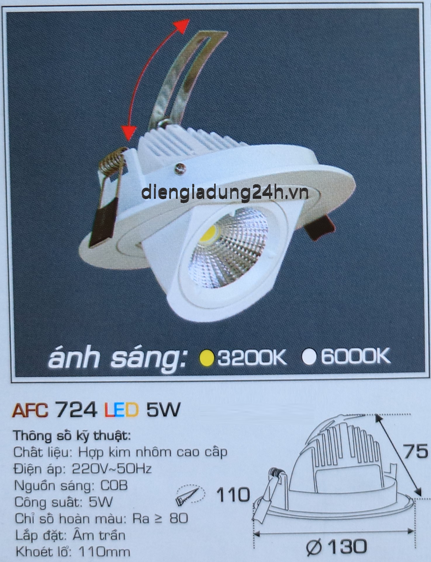 Kích thước: Ø 130 x H 75 mm, Khoét lỗ: Ø 110 mm