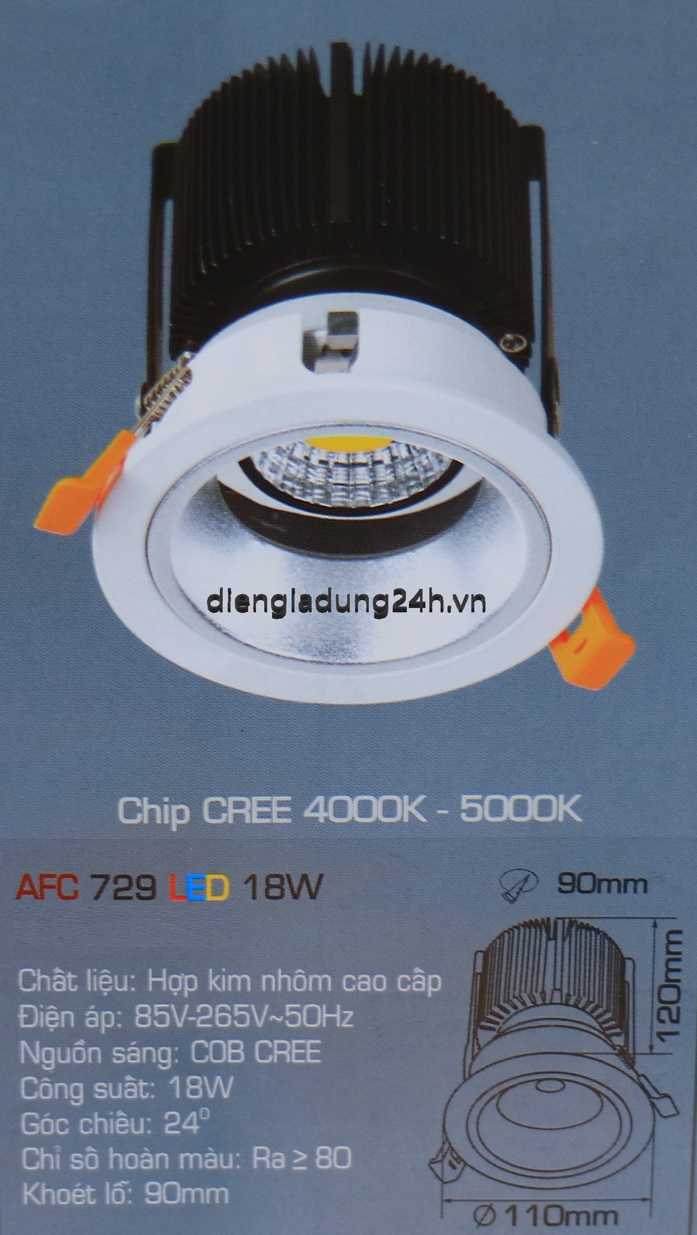 Kích thước: Ø 110 x H 120 mm, Khoét lỗ: Ø 90 mm