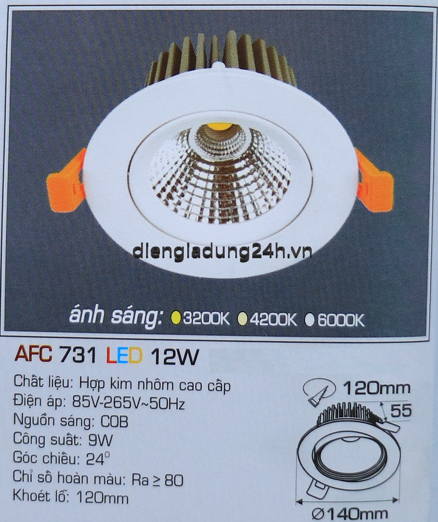 Kích thước: Ø 140 x H 55 mm, Khoét lỗ: Ø 120 mm