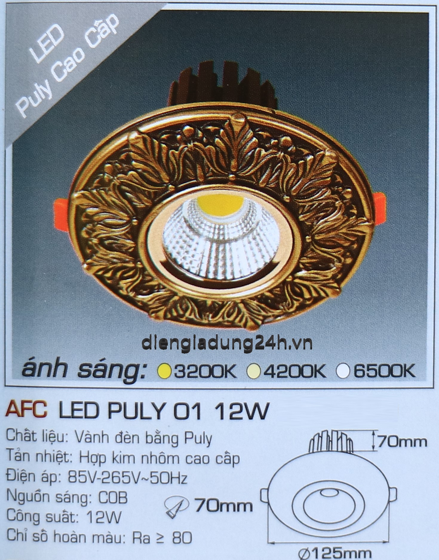 Kích thước: Ø 125 x H 70 mm, Khoét lỗ: Ø 70 mm
