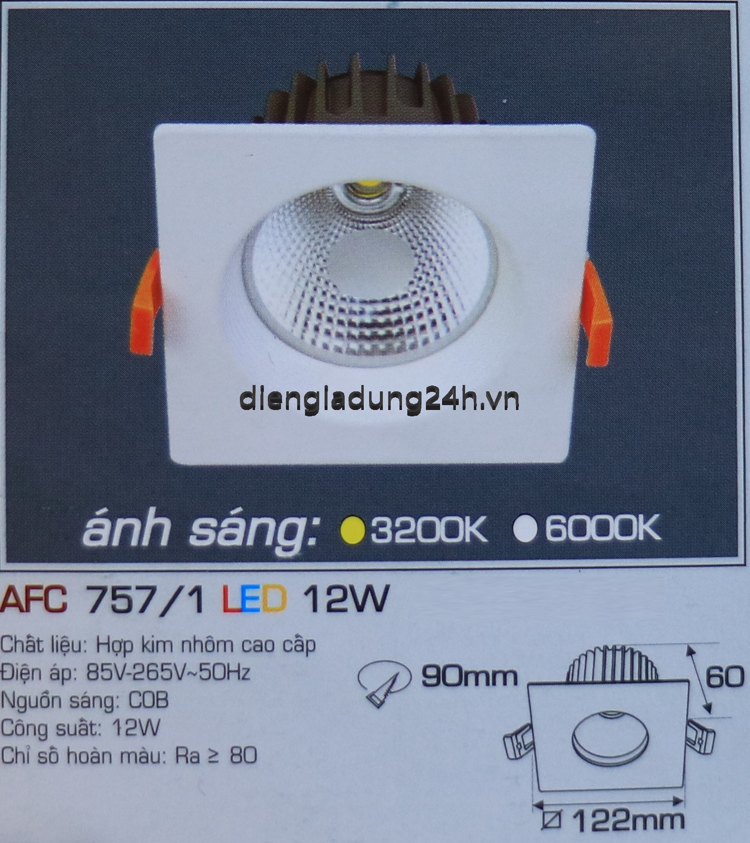 Kích thước: Ø 122 x H 60 mm, Khoét lỗ: Ø 90 mm