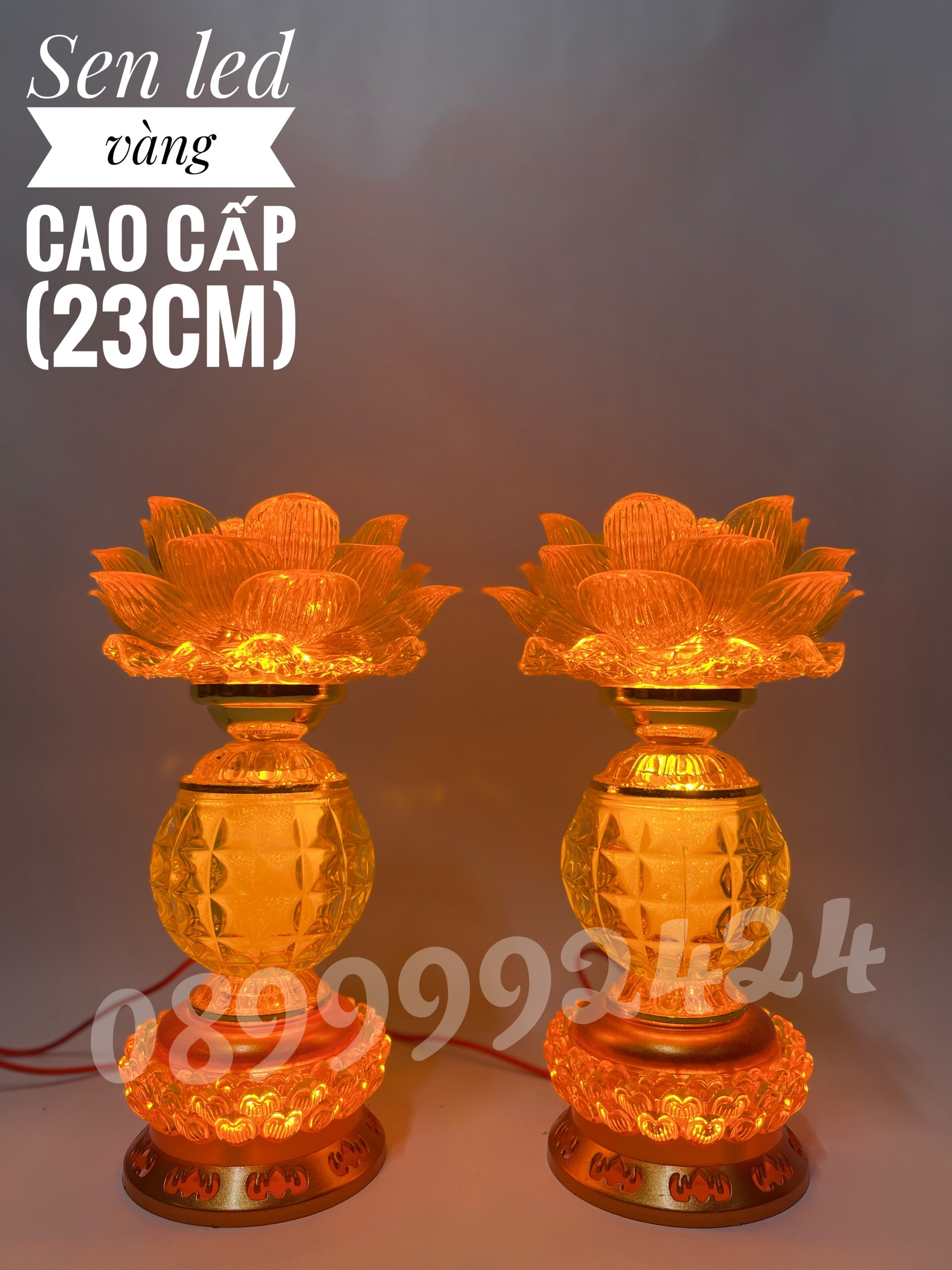 Thương hiệu: Trung Quốc | Đèn thờ cúng siêu sáng thân pha lê - bông nhựa đổi màu và màu vàng cao 23cm GIÁ BÁN 1 CẶP,