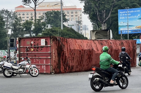 Xe container kéo rơ-moóc hàng chạy qua vòng xoay ngã 6 Cộng Hòa, TPHCM đã bị lật ngang. Tai nạn khiến giao thông khu trung tâm rối loạn.
