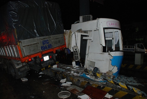 Tại hiện trường, xe tải 65C tông sập thanh chắn bảo vệ cabin và tông vỡ nát cabin thu phí. Sau cú tông, chiếc xe hư hỏng nặng phần đầu và gầm xe. Nhân viên thu phí may mắn thoát chết trong gang tấc, chỉ bị xây xát nhẹ. Xe tải nhỏ và xe 4 chỗ hư hỏng nặng.